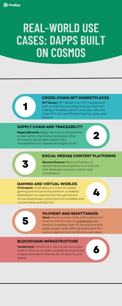 These are just a few examples of the diverse range of dApps and projects leveraging the Cosmos ecosystem. Cosmos’s emphasis on interoperability, scalability, and customization makes it a compelling choice for developers looking to build decentralized applications for various real-world use cases.